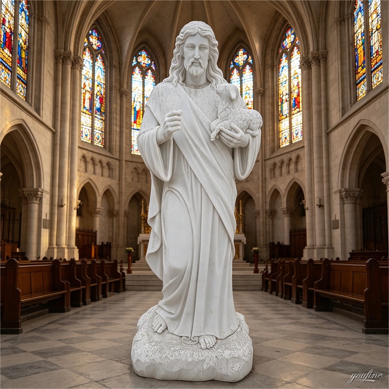 Ещё один значимый образ —Иисус‑Пастырь. На таких статуях Спаситель изображён с нежным, заботливым выражением лица: одной рукой он прижимает к себе ягнёнка, а в другой держит пастуший посох.