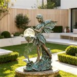 Она стоит, слегка опираясь одной ногой на основание, а её ладони свободно обнимают стеклянный шар-светильник. В этой позе нет ничего застывшего — кажется, будто фея замерла на мгновение, отвлечённая какой-то маленькой живой деталью в саду неподалёку.